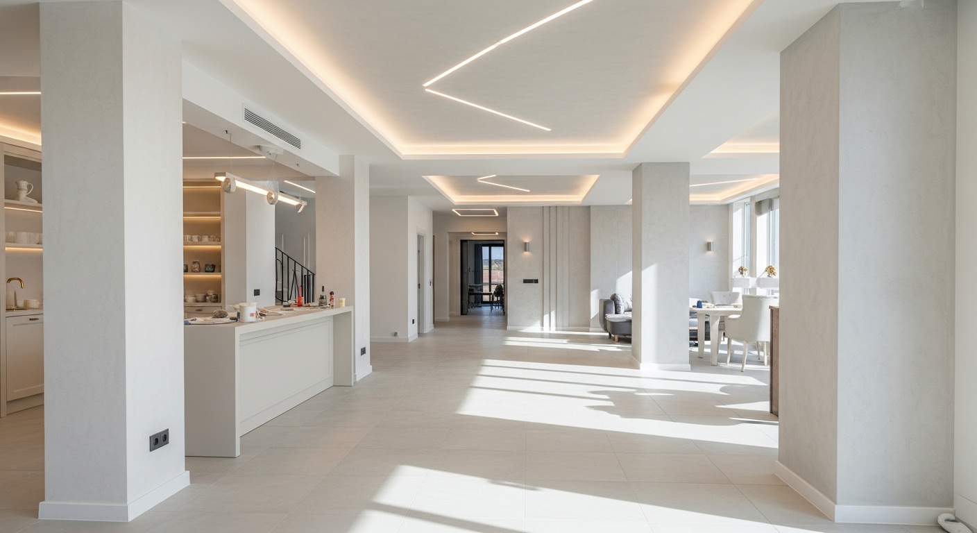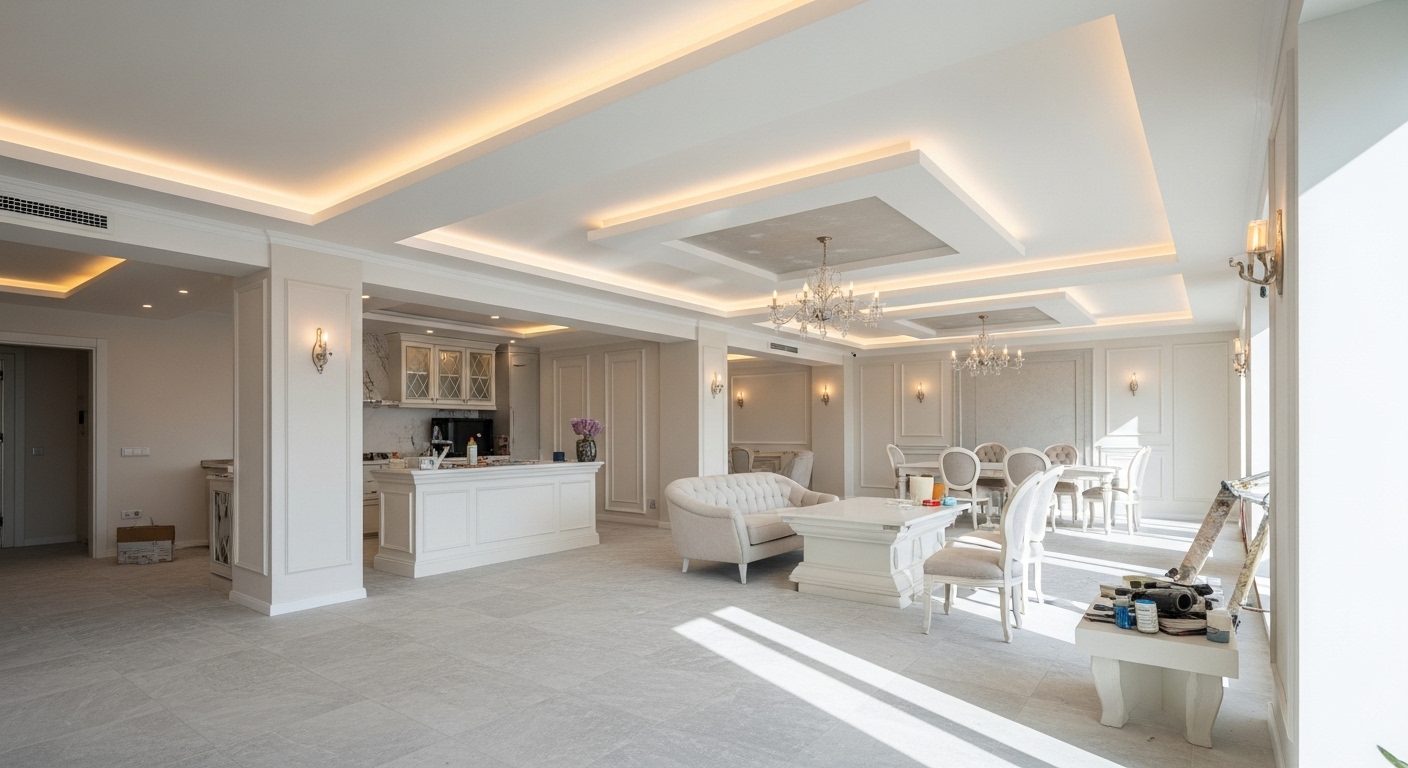 Ev, ofis ve ticari alanlarda alçı sıva, alçıpan, asma tavan ve dekoratif uygulamalarla yaşam alanlarını modern ve şık hale getirir.
